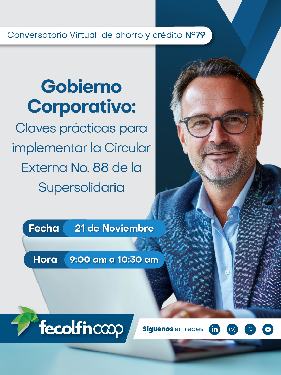 | La Circular Externa No. 88 consolida un marco renovado para el buen gobierno en las Cooperativas y Fondos de Empleados; su implementación exige una visión técnica y alineación institucional. Por lo anterior, Fecolfin tiene el gusto de invitarlos al conversatorio virtual de ahorro y crédito No. 79, un espacio para comprender y proyectar los nuevos estándares de buenas prácticas de gobierno en cooperativas de ahorro y crédito. En este conversatorio presentaremos los principios, las obligaciones y las recomendaciones de la Supersolidaria, para una implementación adecuada y sostenible.📅 Fecha: 21 de noviembre del 2025 🕘 Hora: 9:00 a.m. a 10:30 a.m. 💻 Modalidad: Virtual (el enlace se enviará a los inscritos) La participación requiere inscripción previa. Una vez registrado, recibirás el enlace de acceso al correo electrónico proporcionado. 📌 Importante: Este evento no tiene costo de inscripción, no obstante, es necesario realizar el registro previo e ingresar el día del evento con tu nombre completo y el nombre de la entidad que representas, para facilitar el proceso de identificación. Para más información, contáctanos al correo: 📧 auxiliar@fecolfin.coop o al 📱 316 023 9942. |
