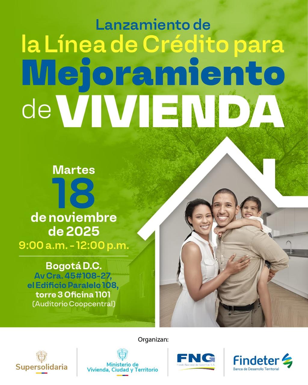 La Superintendencia de la Economía Solidaria, en conjunto con el Ministerio de Vivienda, Ciudad y Territorio, el Fondo Nacional de Garantías (FNG) y la Financiera de Desarrollo Territorial (Findeter), tienen el gusto de invitarle al lanzamiento oficial de la Línea de Crédito para Mejoramiento de Vivienda, una iniciativa que busca fortalecer el acceso a soluciones de financiamiento para el mejoramiento de hogares de familias vinculadas al sector solidario. Esta nueva línea de crédito representa un paso significativo hacia la inclusión financiera, la vivienda digna y el fortalecimiento del modelo solidario, reafirmando el compromiso institucional de las entidades organizadoras con el bienestar de las comunidades y el desarrollo sostenible.Este evento se llevará a cabo el Martes, 18 de noviembre del 2025, a partir de las 09:00 a.m., en el Auditorio Coopcentral, 📍Ubicado en la Av Cra. 45#108-27, el Edificio Paralelo 108, torre 3 Oficina 1101, en la ciudad de Bogotá. INSCRÍBASE ACÁ |