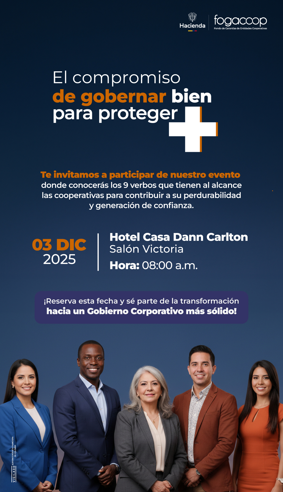Fogacoop se complace en anunciar un hito trascendental para la perdurabilidad de las cooperativas inscritas:  el lanzamiento oficial  de la herramienta estratégica de Gobierno Corporativo, que presentaremos en el evento “El compromiso de gobernar bien para proteger más”, y al cual están invitados los gerentes y presidentes de Consejo de Administración de cada una de las cooperativas inscritas en el país, o sus delegados: