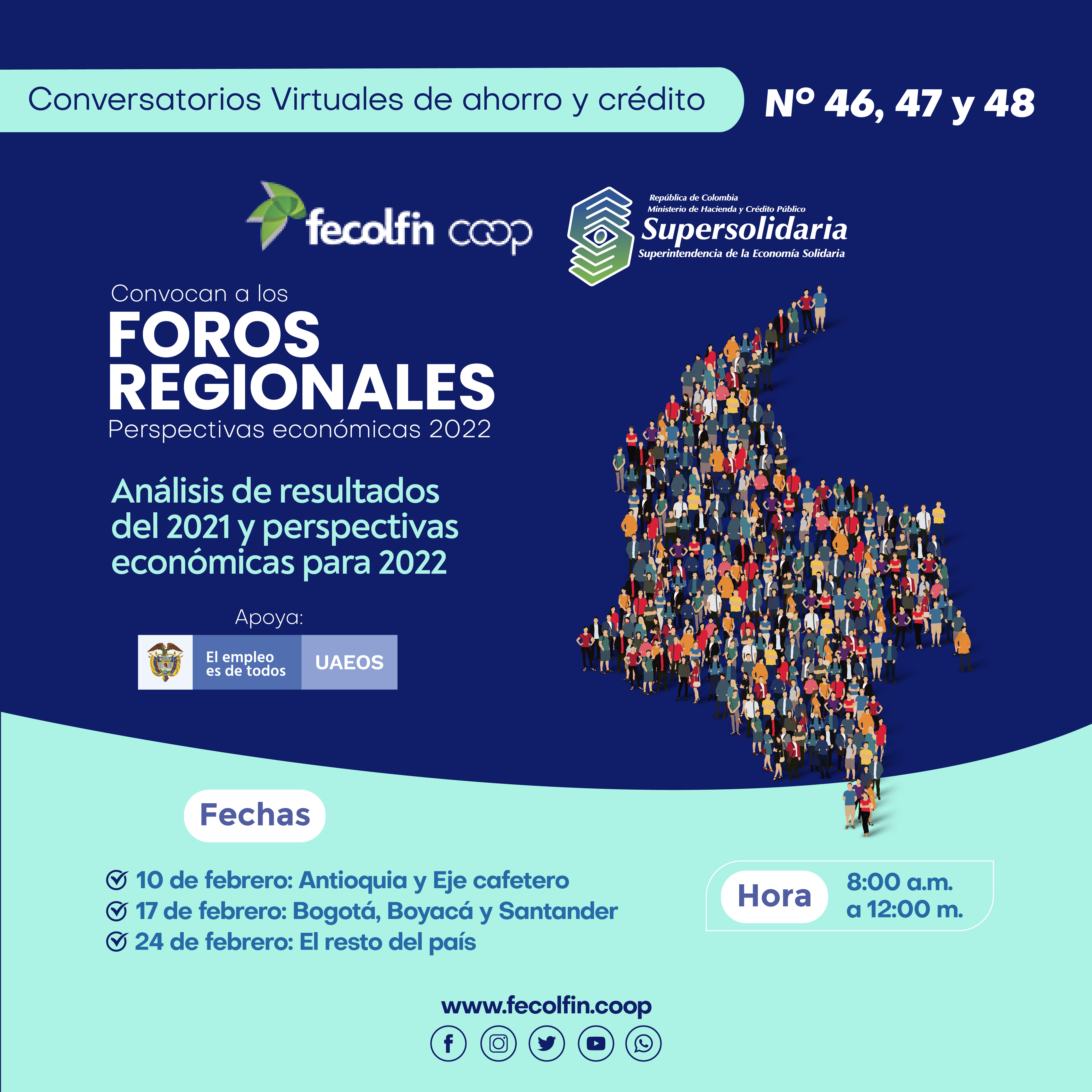 Fecolfin se complace en invitarlos a participar de los foros económicos regionales “Análisis de resultados del 2021 y panorama económico 2022”. Nos permitimos informar que dada la situación de salud derivada del COVID-19 los foros se realizarán en la modalidad virtual, en las siguientes fechas: