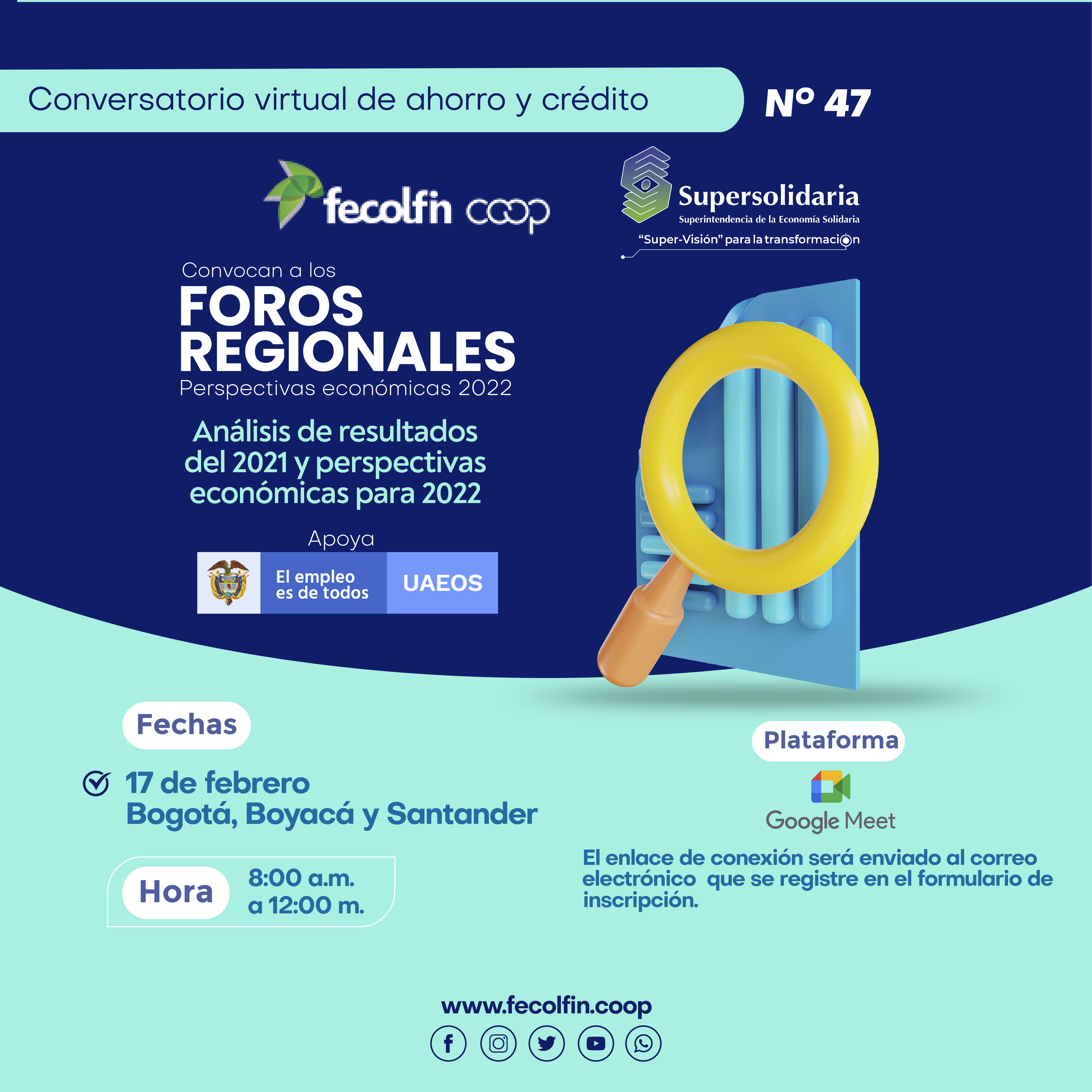 Este foro es liderado por Fecolfin y cuenta con el apoyo de la Unidad Administrativa Especial de Organizaciones Solidarias. En este encuento se contará con la participación de expertos en cada área, así como representantes de la Superintendencia de la Economía Solidaria tales como: