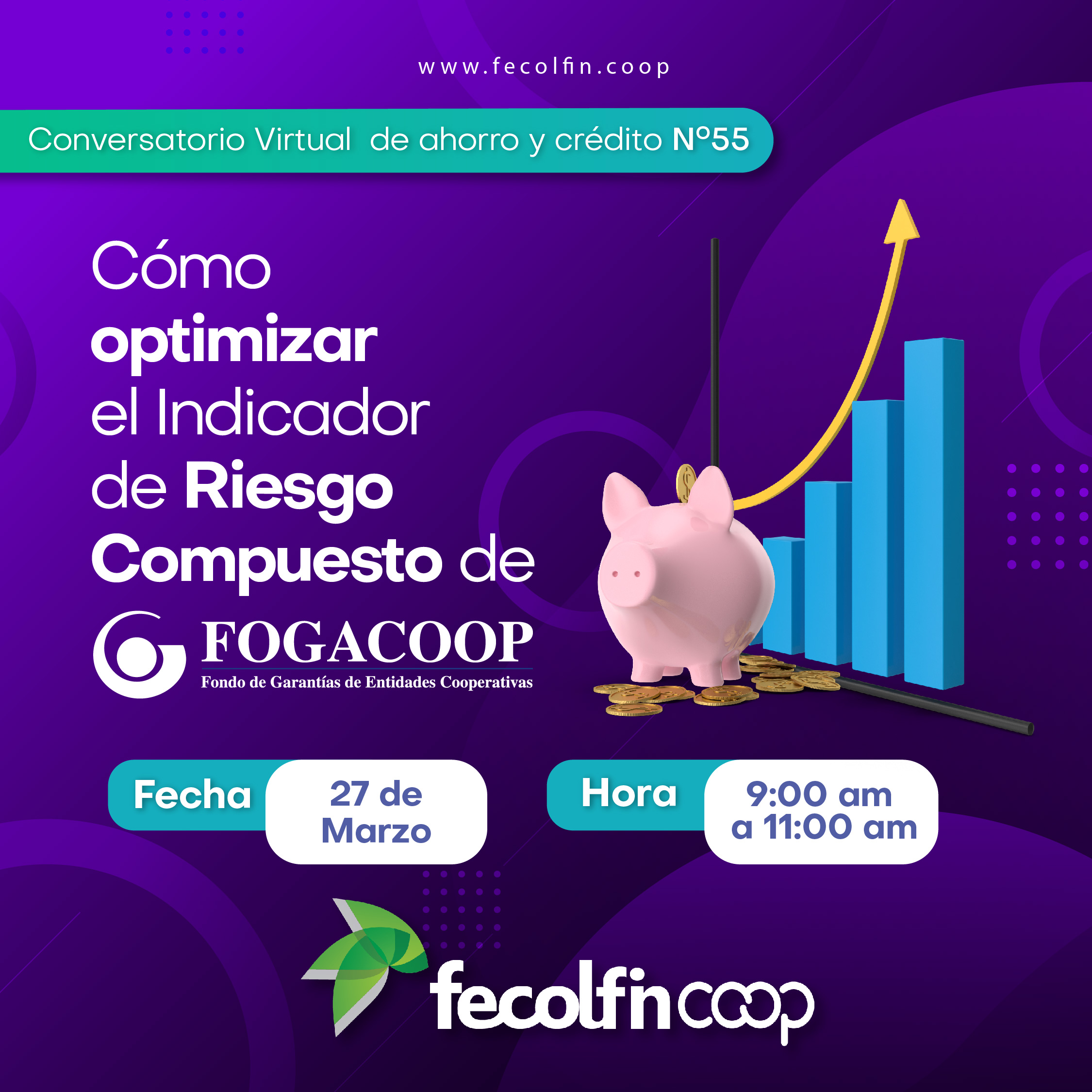 Fecolfin y Fogacoop tienen el gusto de invitarlos a participar el próximo 27 de marzo del conversatorio virtual de ahorro y crédito No. 55 en el que se explicará a profundidad cómo optimizar el Indicador de Riesgo Compuesto de Fogacoop y cómo beneficiarse en la reducción de los costos de la prima del seguro de depósitos. Durante esta jornada los expertos de Fogacoop expondrán el Indicador de Riesgo Compuesto -IRC, el cual es insumo del cálculo de la prima por nivel de riesgo de una cooperativa. Se presentará cada una de las razones financieras que componen el IRC, esta información permitirá a las cooperativas tener un referente para la administración de los principales riesgos financieros.Expertos |