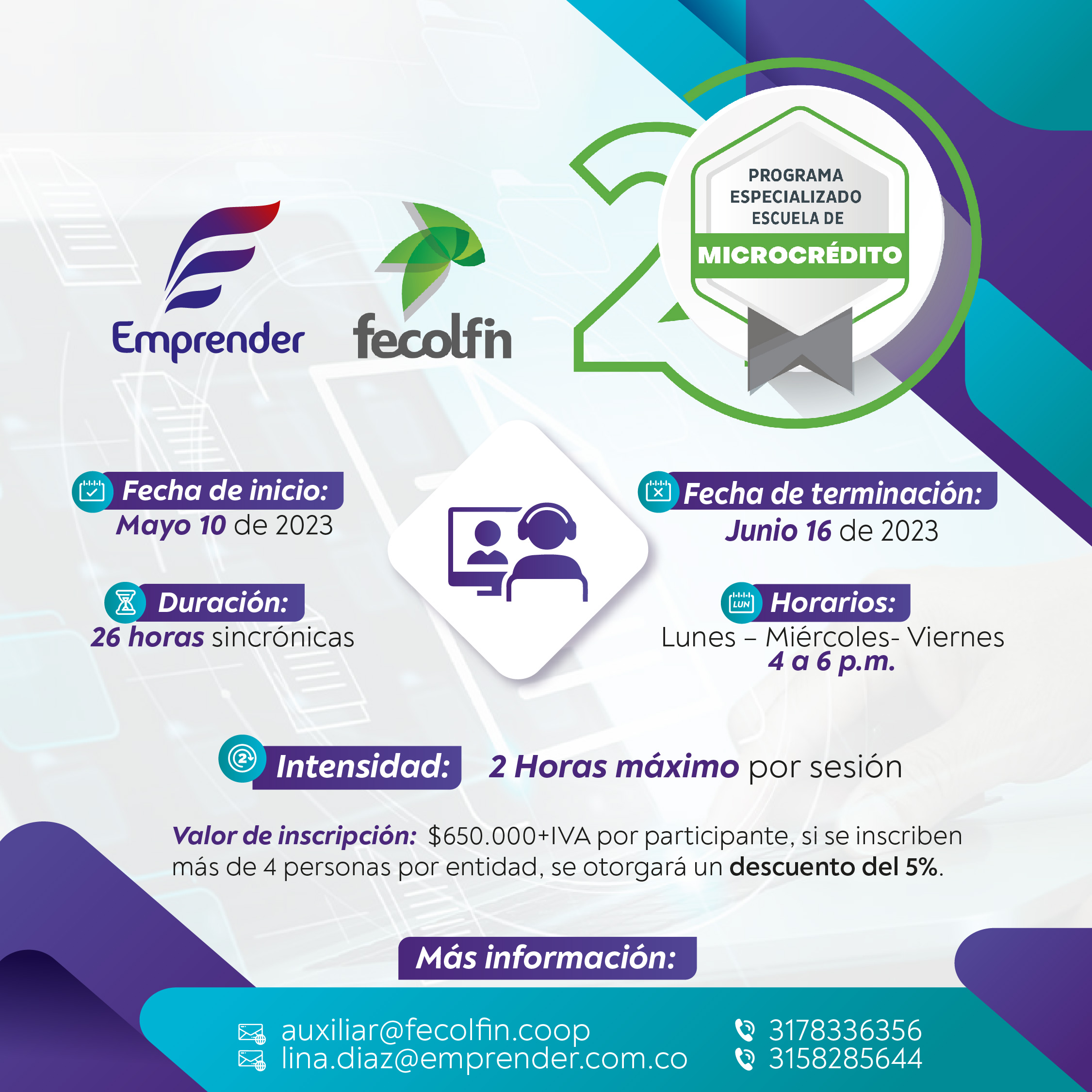 Ante la excelente respuesta por parte de las cooperativas y el interés por participar en este espacio de formación sobre las microfinanzas. Fecolfin en alianza con Emprender, iniciarán el próximo 10 de mayo la Segunda Escuela de Microcrédito, la cuál también tiene cupos límitados. El propósito de este espacio es ofrecer a las entidades cooperativas, un espacio académico y práctico en la temática de microcrédito en el país, así como transmitir las metas y principios metodológicos para operar unidades de microcrédito como un modelo clave en la estrategia de Inclusión Financiera y Economía Popular del Gobierno Nacional, Durante estas sesiones 100% virtuales se abordarán temas como el marco regulatorio de microcrédito, sistema de riesgo de crédito, tecnología microcréditicia, negociación efectiva en cobranza, herramientas de gestión y casos de estudio. Todo el proceso estará acompañado por un grupo de expertos en la materia y por el equipo de Fecolfin que atenderá todas las inquietudes de los participantes. El valor de inscripción de escuela de microfinanzas es de $650.000+IVA por participante. Así mismo, por la inscripción de más de 4 personas por entidad, se otorgará un descuento del 5%. Para recibir más información o resolver cualquier inquietud comuníquese con nosotros a los correos auxiliar@fecolfin.coop y lina.diaz@emprender.com.co, o a los números de celular 3178336356 y 3158285644. |