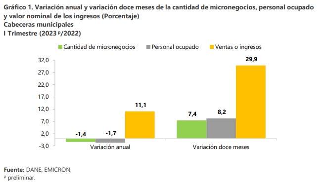 En esta oportunidad el informe señala que para este trimestre la cantidad de micronegocios disminuyó 1,4% en comparación con el mismo periodo del año 2022. Asimismo, el personal ocupado por estas unidades económicas disminuyó en 1,7%.  Respecto a los ingresos de los micronegocios crecieron 11,1% en este mismo intervalo de tiempo.