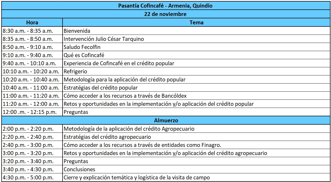 Por lo anterior, con el objetivo de seguir reforzando los conocimientos sobre las estrategias y líneas metodológicas para la aplicación del Crédito Popular, Fecolfin se permite extender una cordial invitación a participar de una pasantía en las instalaciones de nuestra Cooperativa asociada Cofincafé, ubicada en la carrera 14 # 22-09, Torre Cofincafé, auditorio Solidaridad, piso 7, en Armenia, Quindío, durante los días 22 y 23 de noviembre a partir de las 8:30 a.m.