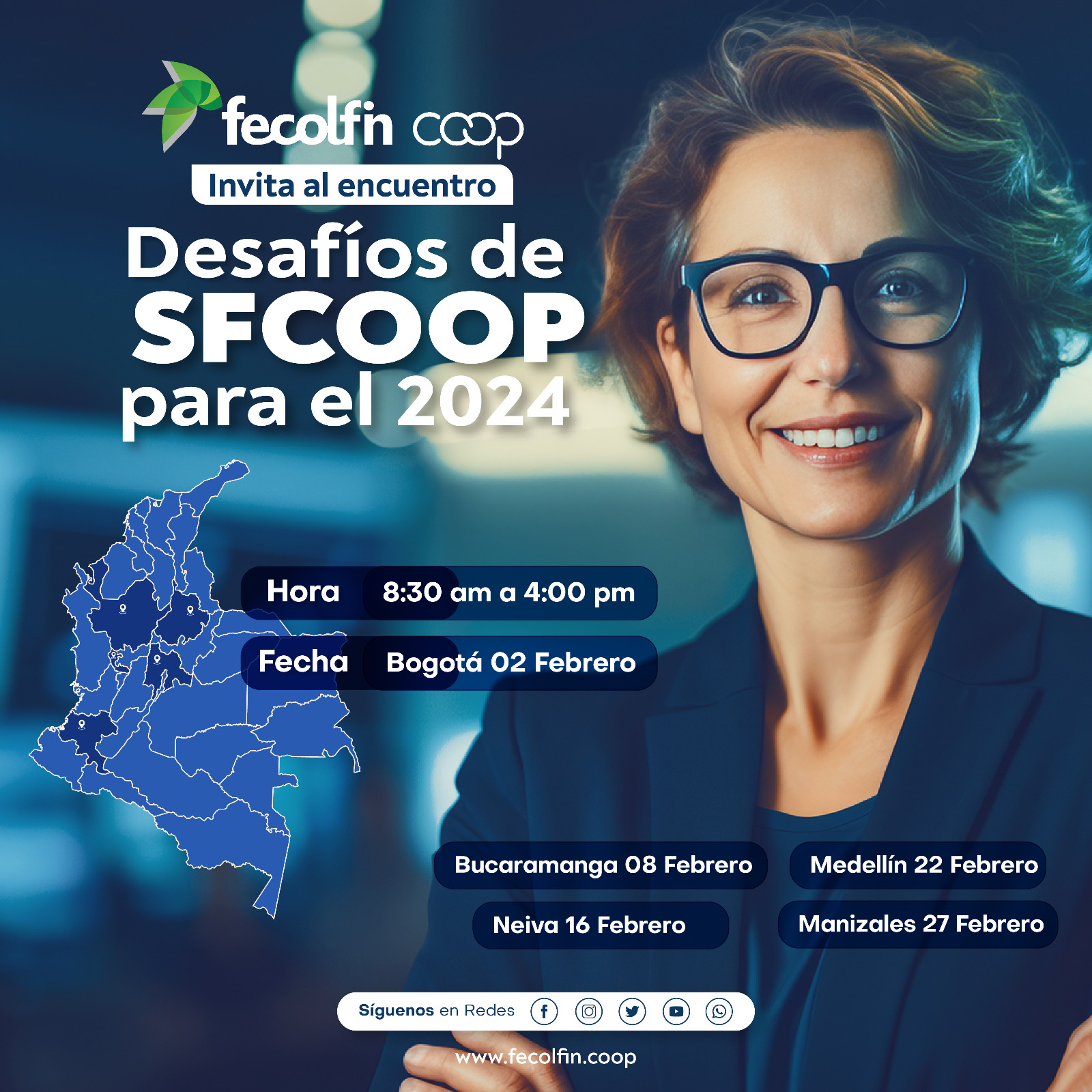 Fecolfin los invita a participar de los encuentros regionales “Desafíos del SFCOOP para el 2024”. Nos permitimos informar que estas jornadas se realizarán de manera presencial en las siguientes fechas y ciudades: Bogotá 02 de febrero: Compensar Ak 68 # 49A – 47 Bucaramanga 08 de febrero: Hotel Chicamocha Calle 34 #31-24 Neiva 16 de febrero: Hotel Neiva Plaza Calle 7 #4-62 Medellín 22 de febrero: Hotel Estelar Milla de Oro Calle 3 Sur # 43a – 64 Manizales 27 de febrero: Termales el otoño kilómetro 5 de la vía antigua al Parque Nacional Natural los Nevados. |